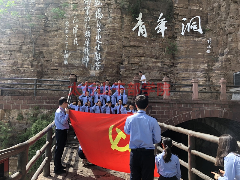 學員們踏上350米的廊橋——“紅飄帶”,來到青年洞洞口。1973年,全國人大常委會副委員長郭沫若親自題寫了洞名。洞口刻有李先念、江澤民題詞。學員們集體在洞口合影留念,并重溫入黨誓詞。
