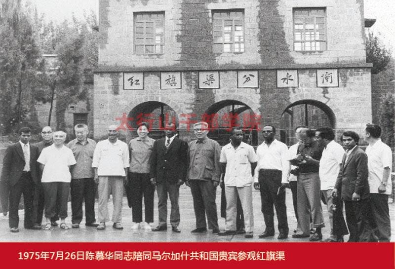 1975年7月26日陳慕華同志陪同馬爾加什共和國貴賓參觀紅旗渠。